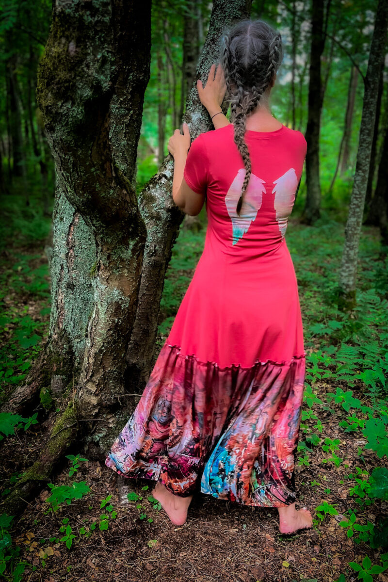 Värvikaks kangatrükiks on valitud spetsiaalne kangas – kandmisele ja pesemisele vastupidav kunstsiid, mis säilitab pärast pesu siidise pehmuse ja siidi hõljuvad omadused. Teosega seelikuosa on sile ning pehme jalgade vastas. Valitud kangas on jahutav ja lendleb iga astumise juures. Vihmas märjaks saades kuivab kiiresti. Allserv on määrdudes kergesti pestav.
